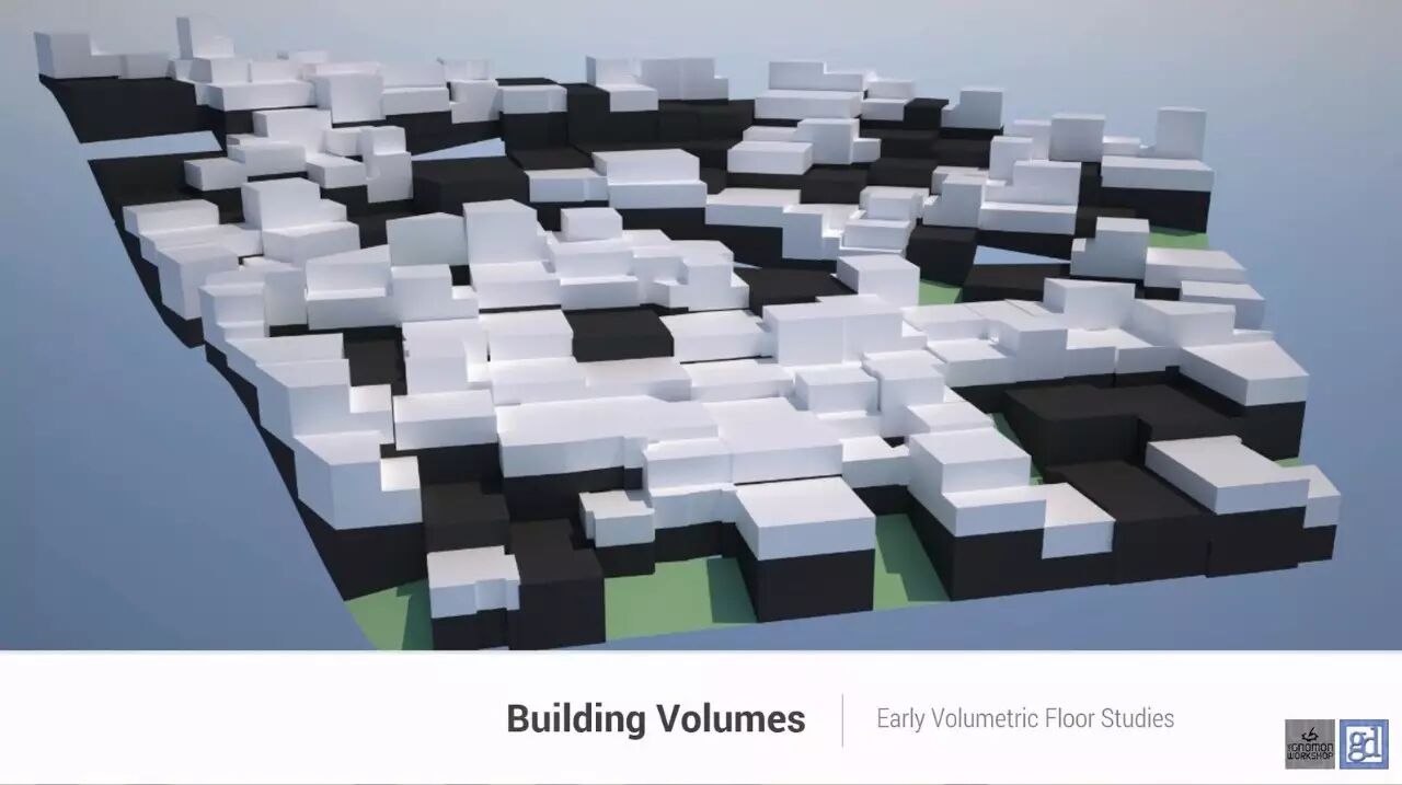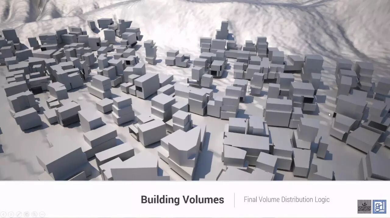 这段代码来自官方的例子,通过这些代码判断出每一个shape属于哪个区域,配合extrude()等命名可以自动可以完成以下的布局。图中中心的区域大部分是highrise,中间的部分更多的是commercial buildings和apartment blocks,偏远的地方更多的是residential和openspace.